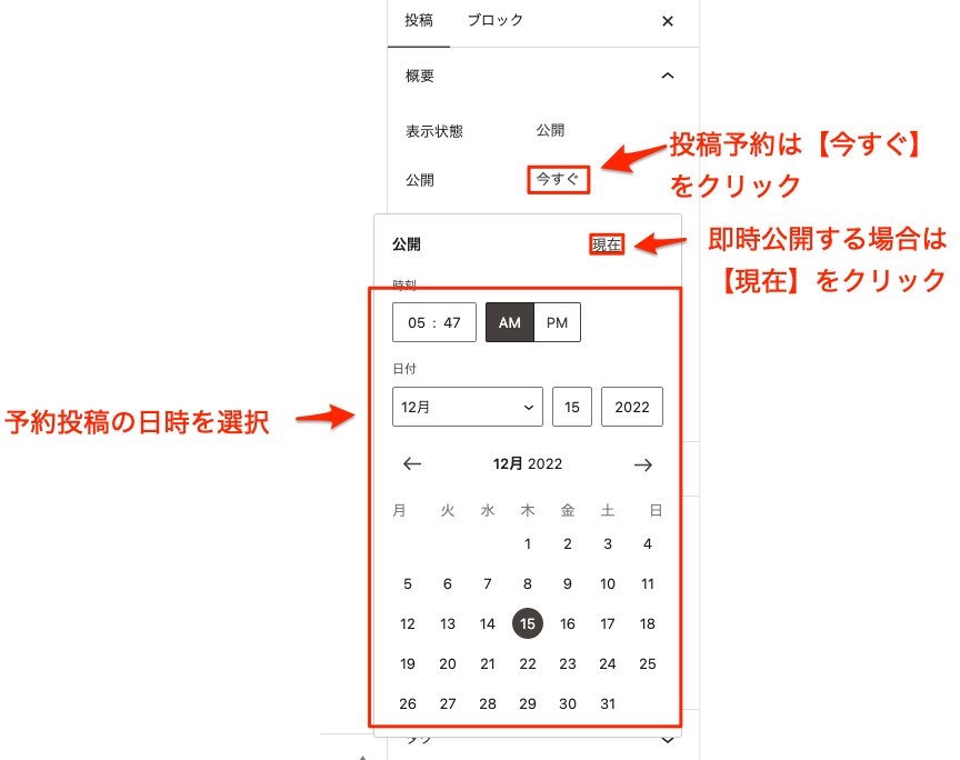 新規投稿ページの右側にある設定項目から公開の【今すぐ】をクリックすると日時設定のカレンダーが開きますので、公開したい日時を予約します。