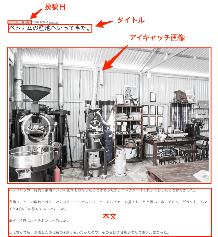 タイトル、本文、カテゴリー、アイキャッチに登録した内容は上図のように表示されます。
